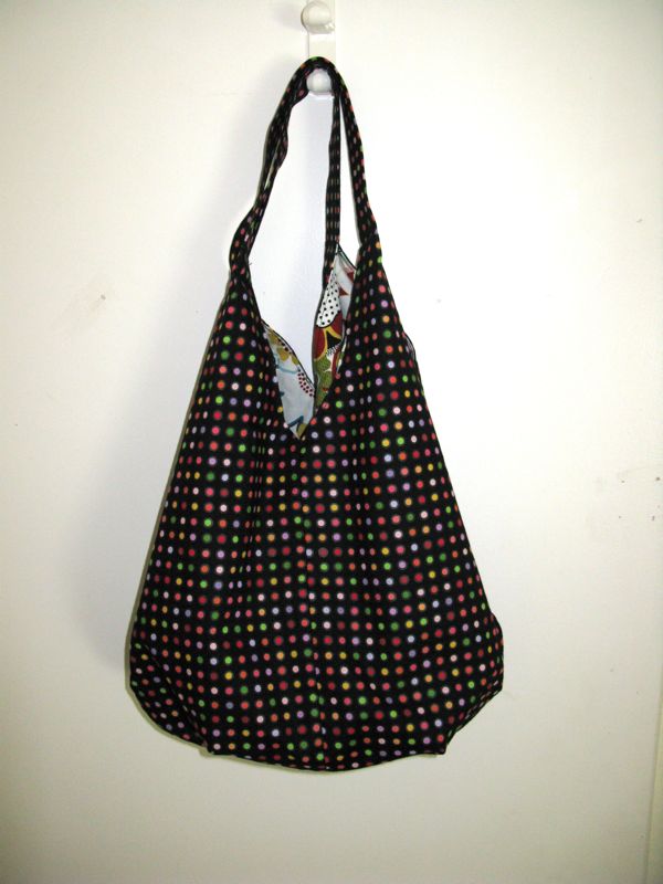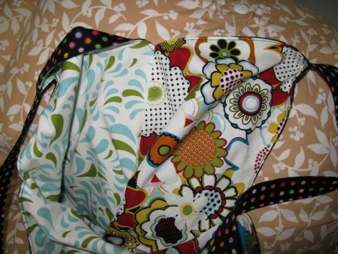 It began last May with Carrie, a friend, who came to stay with one of her friends, Gina. We hung out together for two days, goofing off, playing, eating pastries at 4 p.m. in the afternoon and ruining our dinner, but who cared? When she and Gina left, they presented me with two swaths of quilt fabric: the raindrops print in blue and green and the wild floral print. I loved them both, and couldn’t decide between the two for lining the bag. So, I used both.