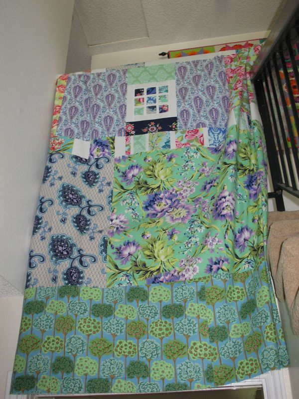 And here’s the backing hanging over the rail.  I’ve spent most of the afternoon on this.  Do you sometimes feel that making an elaborate back is as much work as the front?  And while I do like the idea of pieced backs (I do it quite often) I also REALLY like it when I can stretch out a swatch of Merimekko fabric and just cut out a back in about 20 minutes. Not 3 hours.  I had to add some Kaffe Fasset trees on the bottom of the quilt, as I’m saving some of my Amy Butlers for a travel bag.  And the trees were just hanging around and given the price I paid for them some time ago, pretty economical.  I really have to think hard when the price tag on a yard of quilt fabric is $12.  I must admit, I have walked away more than I might have in the past.