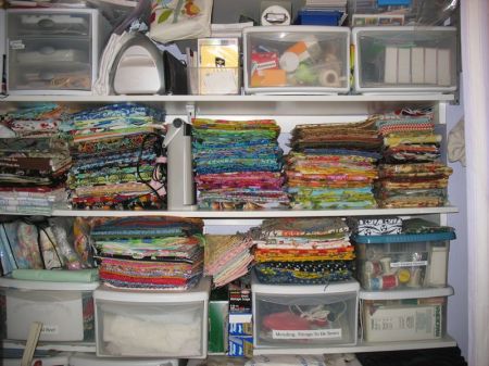 Now that we’ve found our new Six-Step process to alleviate fabric-aholism (see previous post, below), I wanted to show you my constructed closet (vs. de-constructed, all over the floor, spilling off the shelves, closet).  This only took two days of moaning and then sending my husband on an out-of-town trip to take care of.  And like I mentioned in the post last week, I found lots of interesting things.  I mean, I knew I had them, but they had been back-burnered so many times as to be invisible.