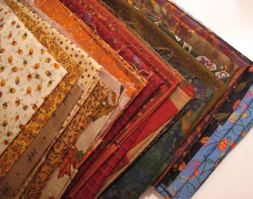 Like this group of fabrics.  No, they are not a “line” like we’re used to buying now (kind of like voting a straight party political ticket).  I do like doing buying a line because everything coordinates, but this is from the early 90s, when variety was considered a virtue.  I was inspired by a friend’s autumn-colored quilt that positively glowed on the wall of her book shop.