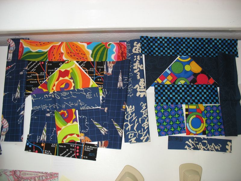 Earlier, this week this is what it looked like with the purse laid out, as I’m trying to figure out where everything goes. I wanted a purse that looked “Think-Freddy-ish” without screaming “HEY I’M A QUILTER!” You know what I mean. Clothes, purses — there’s art, and then there’s I’M-A-QUILTER-clothes. The best example of the latter was when I went to Houston and some woman had made a vest out of all the tote bags, complete with the handles hanging down all over. And yes, I’ve made a garment or two that fit into that category. Let’s not go there, because I still like that jacket.