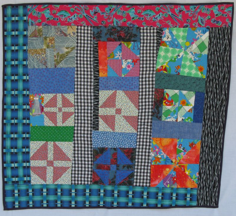 I also took in a utility quilt I had made with Roberta Horton in a class I took when I went to Houston. Roberta didn’t allow us to use our rulers (which made the quilt very “wonky” and crooked), and made us put in an “ugly” fabric so we could learn to work around it. We also had to sew a few of the patches in backwards, but the general appeal for me of this quilt was the idea that quilts don’t always have to be perfection, an idealized thing of beauty. I liked learning that quilts were sometimes made in a hurry and were made to be used.
