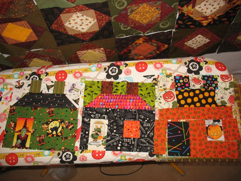 Finally getting back to these little houses, after being gone to Montreal for a few days, then stuck in the Grading Galaxy when I returned.  I could make lists of the things I’m working on, but today — a little progress after a long time away from quilting.  And yes, you can still see my autumn quilt up on the pin wall behind the ironing board.  Add that to the list!
