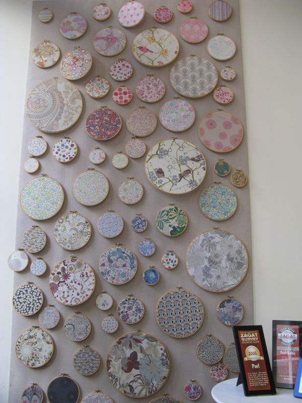 A wall of fabric in hoops. Sometimes we forget that fabric shops like their stash, too.