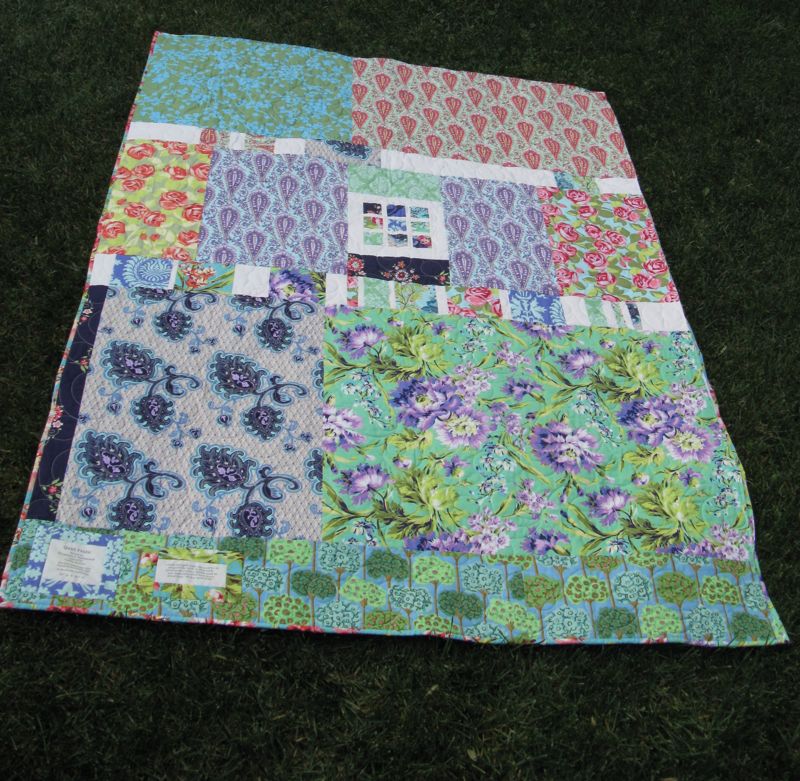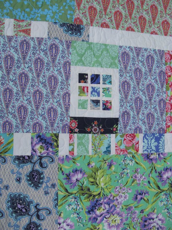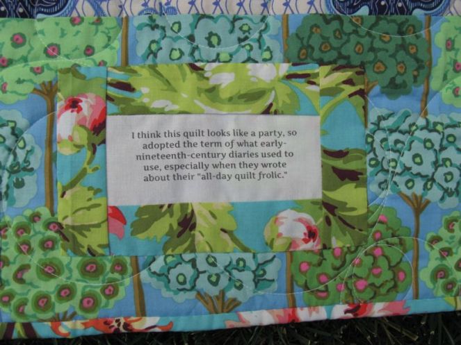 The back is a conglomeration of fabrics. It took forever to sew this together, and usual, the jury is still out on whether pieced backs are “my thing.”