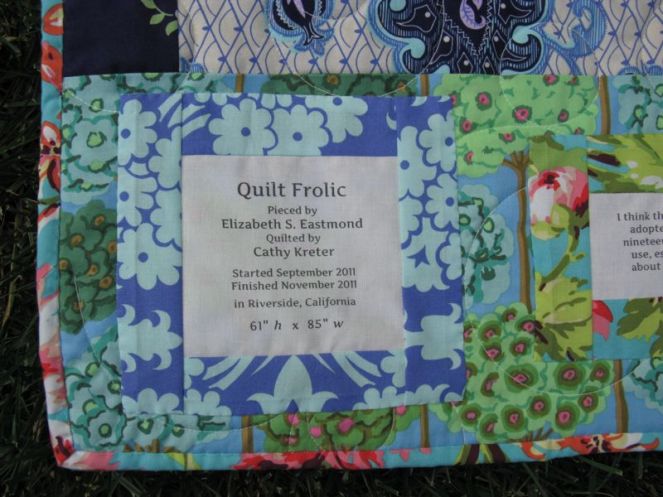 Hey–I even got the labels printed out and sewn on. I hated it when I realized I’d switched the dimensions of this quilt. So now it’s really short and really wide, instead of the other way around. This ought to tell you what a brain fog I’ve been in.