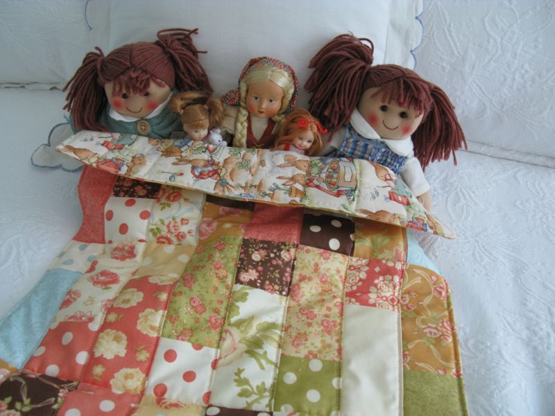 One doll quilt for a granddaughter–done. I have six granddaughters still in doll-playing mode. Five more to go. But not until I recover a little more, according to the doctor today. Lay around more, he says. Rest–stay on the bed. So I guess I’ll do as the dolls above are doing and watch a few more movies.