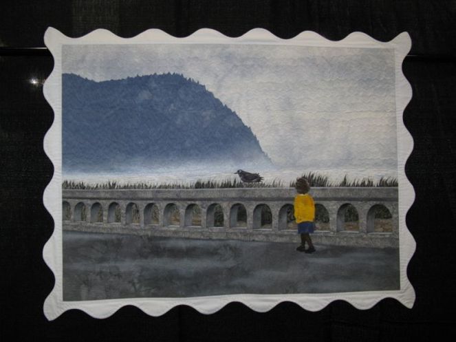 I was very interested in the edge of that bridge–the spiky grasses, the grayed ledge. The grasses were raw edge appliqued, but really fused down somehow so they looked painted on. And the edge? Some fabric paint to blur and soften that so it melted into the picture. Really beautiful.
