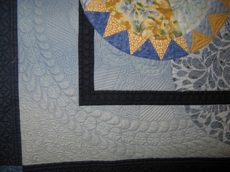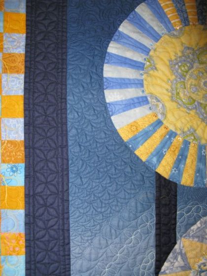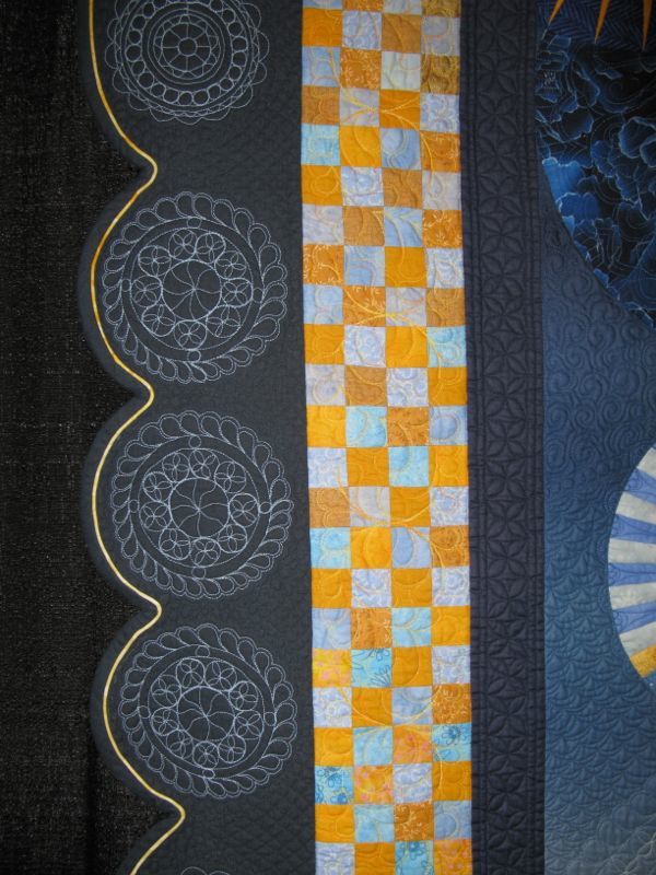 Sunlit Circles, from Ann Petersen of Surprise, AZ uses spiky circles floated over the top of her quilt. What makes this one really interesting, I think, is that border of quilted circles, with an occasional scalloped edge.