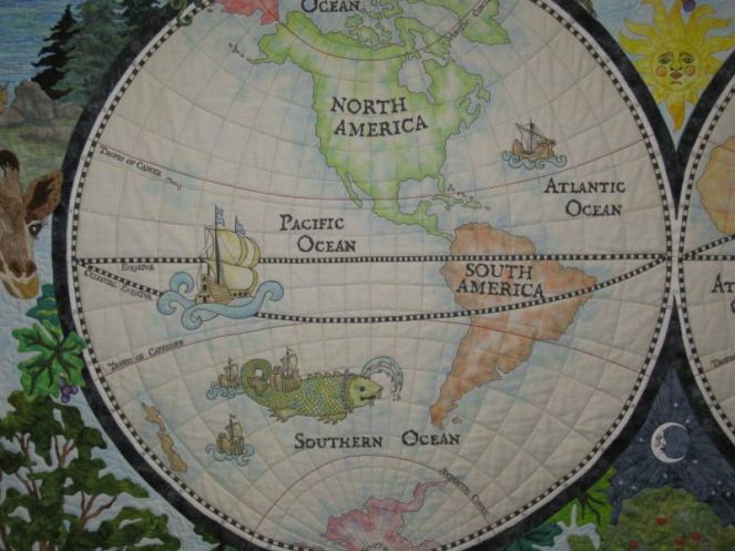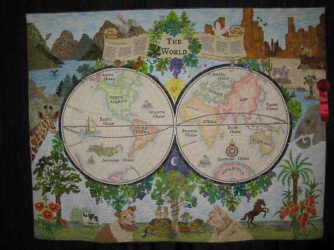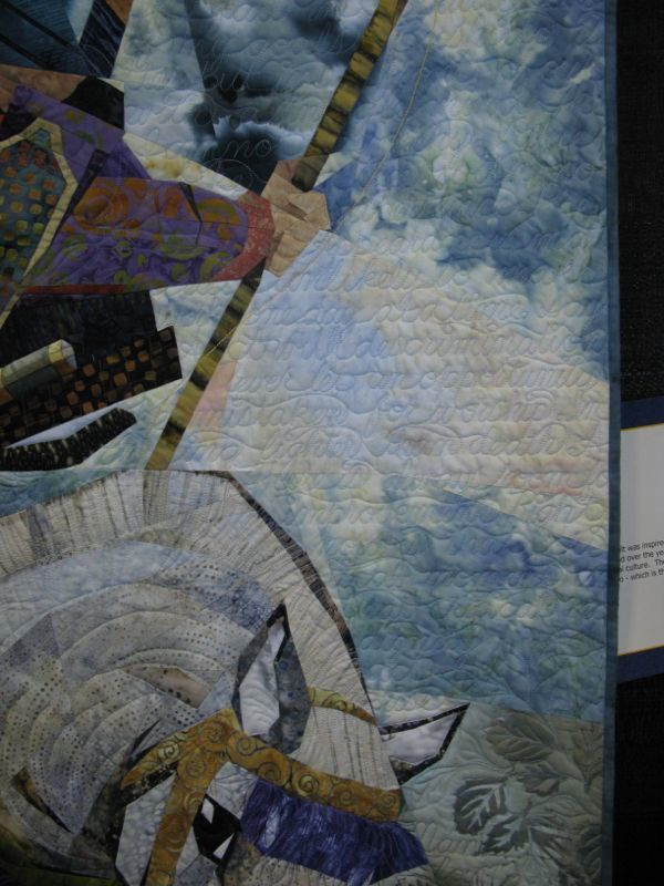 Here was another stunner of a quilt, that unbelievably only garnered a second place. Titled The World, and made and quilted by Rachel Wetzler of St. Charles, Illinois, is her rendition of the genesis of the world. It’s a well-balanced composition with great detail and good use of color and technique. Maybe it only got a second because it didn’t have any sparkles on it? (Can you tell I’m so done with the sparkle business?)