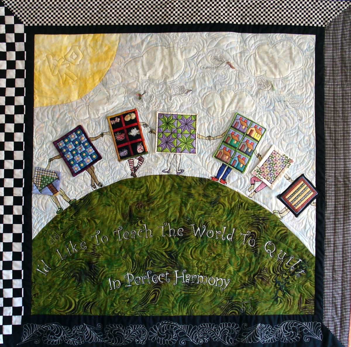“The letters written across the earth were done with a permanent pen, and then I quilted around each of the letters. The legs, arms and quilts were done with fabric pens. Each of the little quilts was then quilted individually before being appliqued to their little person in the larger quilt. On the sun I trapunto-ed the Chinese symbols for harmony and the doves flying in the sky are carrying various thread bits. The quilt was made to bring a smile to people’s faces and to share in the joy of each quilt maker’s journey.”