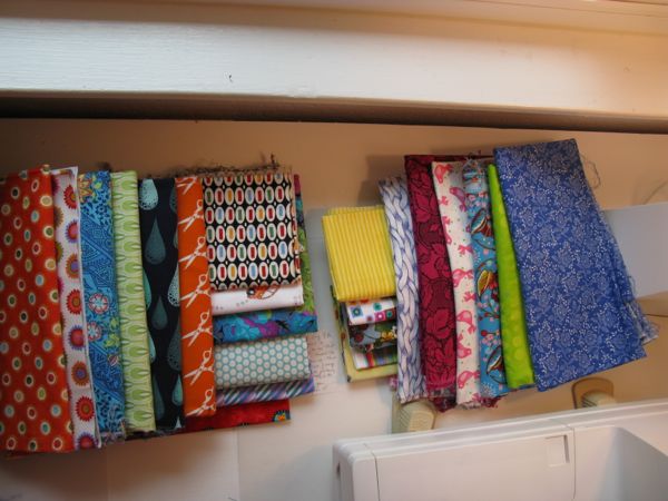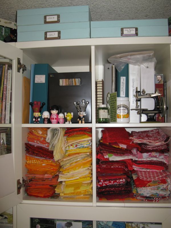 Didn’t used to, until a bunch of reds (shown above, along with my Japanese toys) wouldn’t stop bleeding into the rest of the fabrics (I think it was right after formaldehyde was banned as a fixative).  Now I like to throw them in the washer right as I come home, dry them until damp and press them up.  I lay them out on the guest room bed until they are fully dry, then fold them into 12″ squares (approx) for storage. I guess it’s a way to get a jump on playing with the fabric.