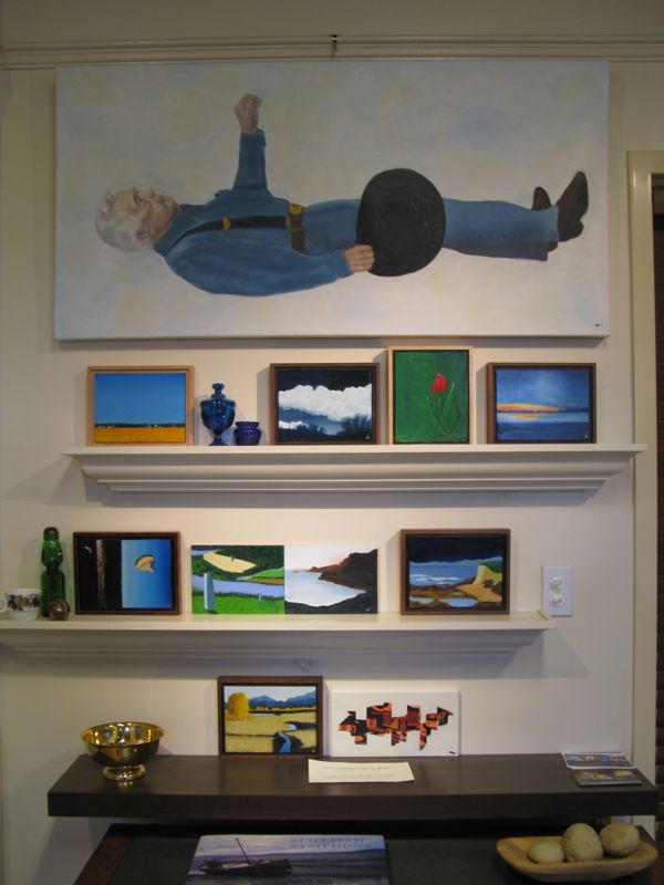Like Dad’s painting of the Sideways Man in his painting studio.  My father keeps a journal of his inspiration and creative journeys, and this was inspired by an advertisement in the New York Times for a series of lamps–a woman was lying down underneath the hanging globes.