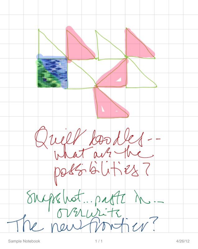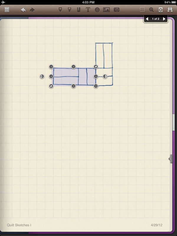 I’ve been quite curious to see if I could use any of the iPad’s apps to draw quilts, or even attempt to draw anything. I had fallen in love with the press for Pages, and spent quite a bit of time looking at reviews of that. I also typed in Penultimate vs. Noteshelf (mainly because I kept seeing that app mentioned) and to find a review that talked about the latest upgrade, I had to keep clicking away.