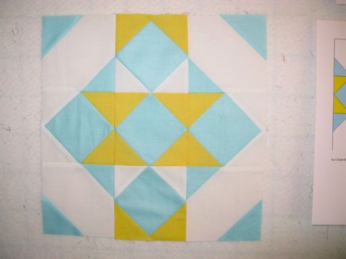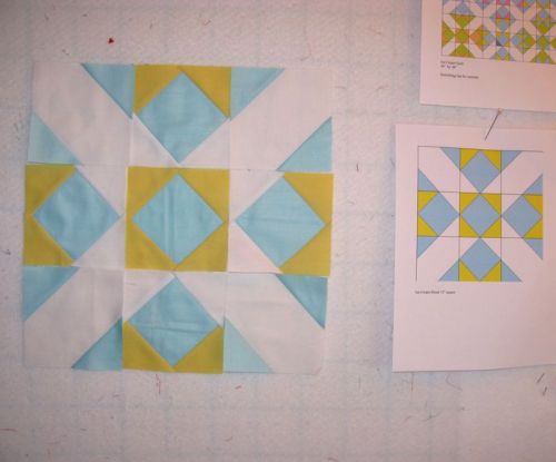 All the units are trimmed up, and I laid them out next to my “pattern,” a print-out of the block. Now sew the first row’s units together, then the middle, then the last row.