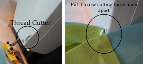 See that thread cutter on the back of the machine that you sometimes use? Use it now, letting it cut your sewn units apart. Quick! and easy.