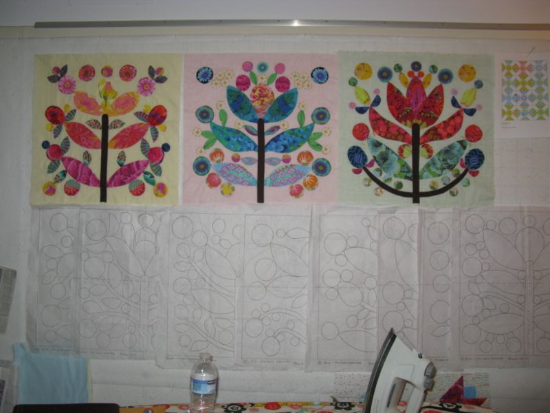 Summer’s starting and the air is hot, the birds chirp-chirping early in the morning, the days longer. I just need my energy to last longer because I’m working on the Lollypop Trees again. My goal is to get all the fabrics cut out and pinned down, as I hope to sew on them all Fall and have the quilt blocks finished by early next year. This is a long-term quilt, not quick. Duh. I’ve traced off the patterns onto freezer paper and cut them all out and am now starting in on Block Five.