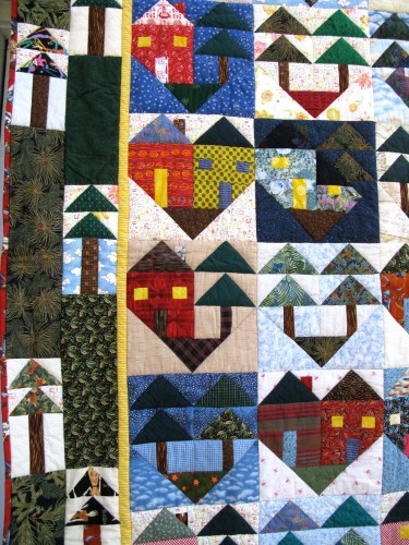 So, what else to quilters do? They make a quilt. I called this Hearts in the Pines. I finished the top and with only a few weeks to go, the semester ending, I called my quilter and she did stitch-in-the-ditch to stabilize the quilt. I stitched the binding on, but didn’t have time to sew it down. I took it to camp and in the few free minutes I had in between kitchen crises (oh, didn’t I tell you that two of the cooks backed out at the last minute and so I was in the kitchen too?), visiting with the girls, my husband (who I’d recruited to join me) and my angel daughter who drove in from Arizona with a friend to help her mom, I finished stitching around the quilt to get that binding on. And much later, I finished the quilting around all the houses and trees.