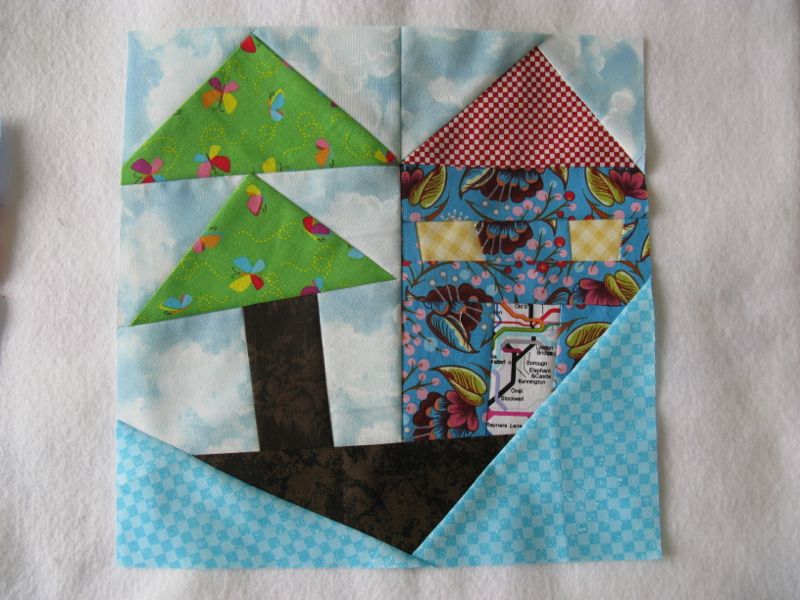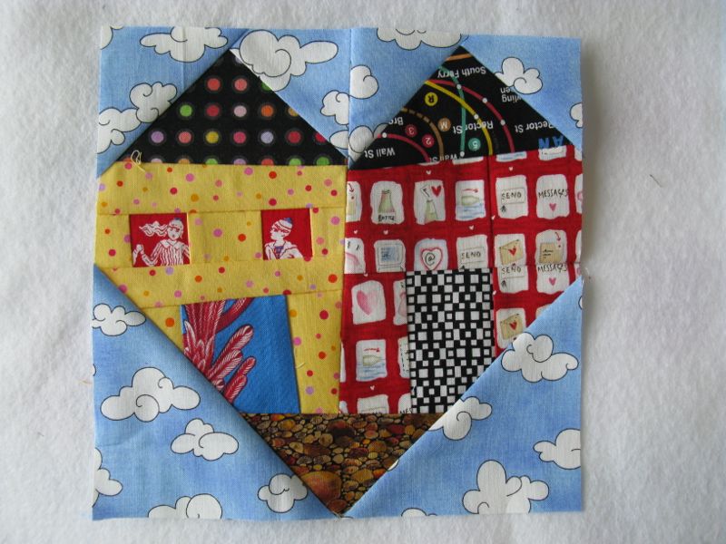 But I thought about how she recently got engaged, and so I drew from a quilt I’d made a couple of years ago (one block is up in my blog header), and made her a block that featured a heart made of two houses. Aw. I’m of the mind you should always celebrate love. Especially “goofy love,” as Krista refers to it. (I remember those days with great fondness.)