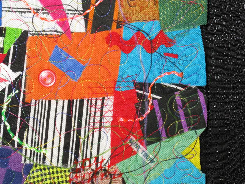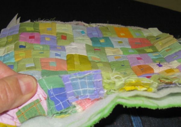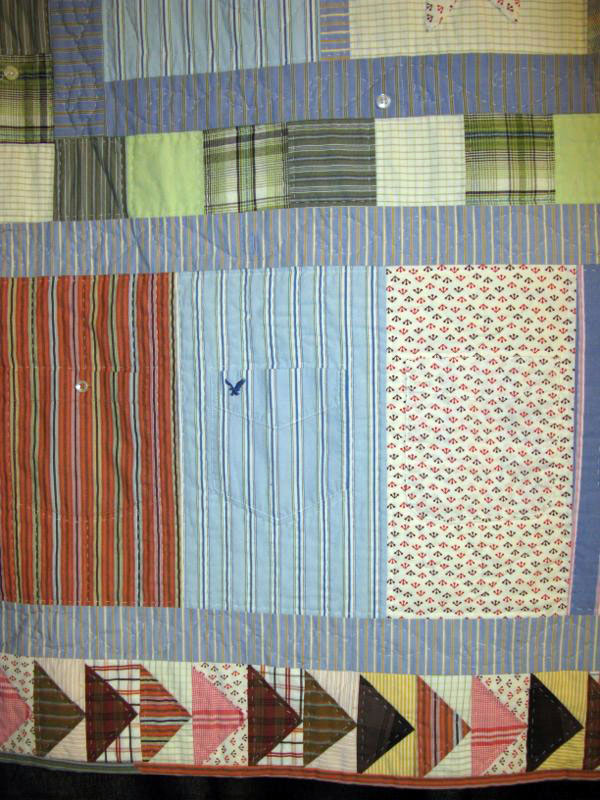 I’m including two detail shots because it’s not until you look at for a while that you realize you are seeing cut-up cast-off shirts. Note the button-front, above, and the pockets, below.