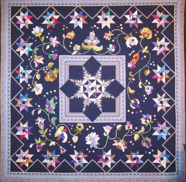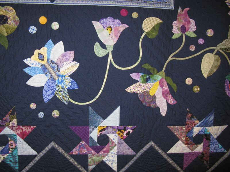 Springtime in the Garden, by Mary Schneider, uses raw edge machine appliqué along with hand appliqué to create this sublime field of flowers. She made some changes to a pattern, to put her own stamp of originality on this creation. (I wished she’d given us the source of her inspiration, though.)