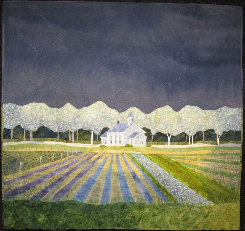 M. C. Bunte was driving across the Indiana countryside during an approaching storm. As she watched, a shaft of sun lit up a small church and the surrounding trees. In this quilt, Shelter in the Time of Storm, she felt it was a message that even when “situations appear threatening, hope — God’s protection for the spirit — exists.”