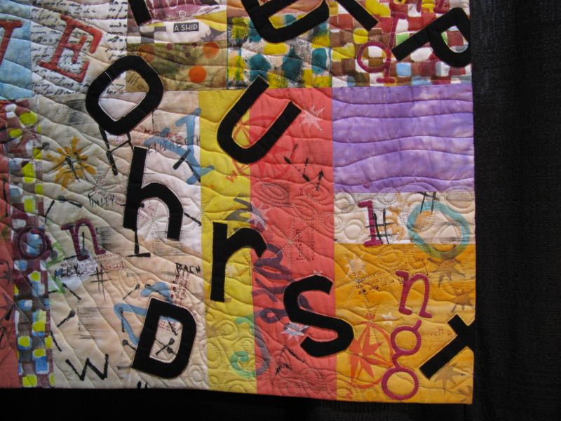 Pretty sure there was an exhibit on text, as there does seem to be quite a few quilts using letters and words in the design. This one, The Word Gets Around, by Louisa Smith, uses commercial fabrics that she manipulated by painting, dyeing and overdoing to obtain the colors she wanted. Her idea for the quilt came from the fact that “our lives are surrounded by text. . . [in] newspapers, advertising and street signs.”
