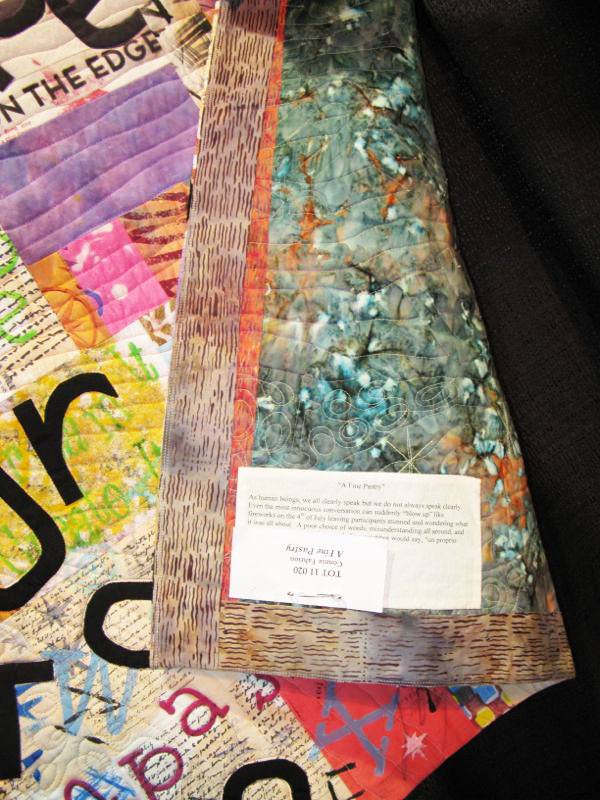 Since Connie Fahrion’s quilt has a lot going on (but it was wonderful to look at in person) I think her choice of the clean edge was masterful. She says the design source for A Fine Pastry came from “the desire to depict how it feels to be part of a communication gone wrong. . . . A poor choice of works, misunderstanding all around and, voila! you have created, as my Italian neighbor would say, ‘un proprio pasticcio’ — a fine pastry.”
