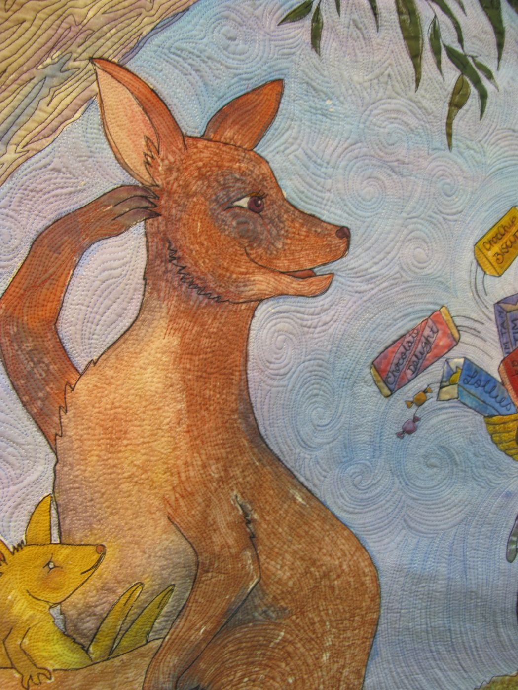 Since I’m the kind of person who always wants to know “how did you do that?” I tend to focus on technique. Sometimes this frustrates, like when I’d like to create a text quilt like the one above and I don’t feel I have the artistic chops to do something like that, but other times my interest in technique lets me appreciate a quilt like this one by Helen Godden, titled Good Onya Sonya Onya Bike! This hand painted, whole cloth quilt allows the free motion quilting to really shine.