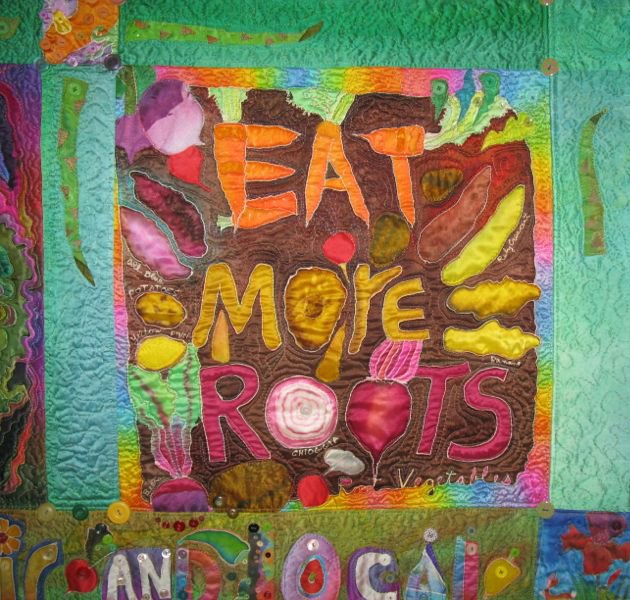 I love her quilt even though she misspelled “vegies.” It’s veggies, if you are going to abbreviate it, but I have to admit that’s one of my “fingernails-scraping-on-the-chalkboard” words. I hate it. But I love this quilt!