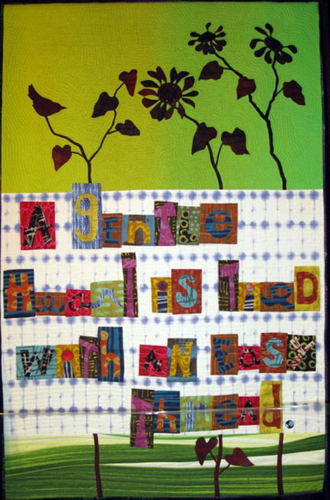 Terry Waldron is a favorite quilter of mine, a local gal who has had some fame and success, but still found time to write me a congratulatory note when she saw my quilt hanging in a show. So I thought it good to end these few posts with not only a lovely quilt, but a lovely quilter. The title of her quilt is A Gentle Heart, based on George Herbert’s statement, “A gentle heart is tied with an easy thread.”