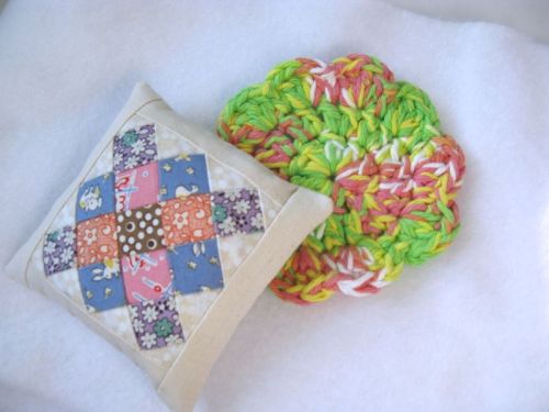 She also sent me these two little treats: a scrubbie (but I’m using it for a mug rug) and a sweet teensy little granny square pincushion.  I pinned it up on my wall for my gigantor pins I use (like corsage or hat pins) when I am monkeying around with fabrics.  Thank you, Krista!