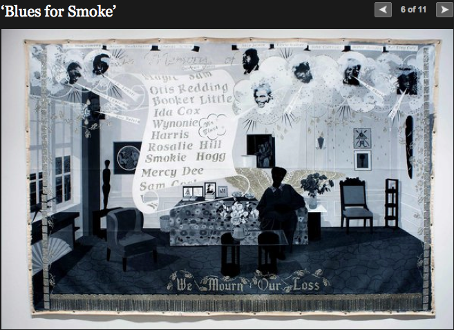 Both of these images are from the NYTimes write-up about Blues for Smoke, a newly opened art exhibit, taking its inspiration from the Blues (the music, not the color, although there does appear to be some riffing on the latter).