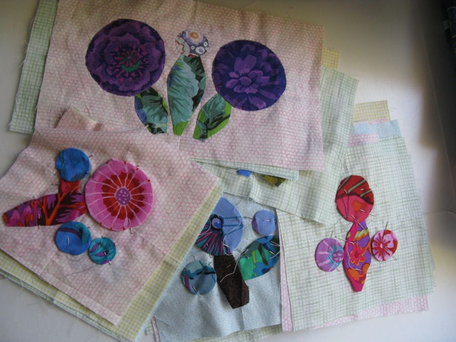 I still have the border blocks to finish. But first, I’m going to enjoy being at this point (for closeups of the last three blocks, head to “Lollypop Trees” in the header). I finished taking off the back of the pieces last night before I went to bed, then pressed it and put it up on the wall. I think sometimes in our rush to have a finish, we forget to stop and smell the flowers. So I’m stopping today to smell these flowers–even though there’s no fragrance, there’s a sweetness to the air in my studio–all these up on the wall. They’ll cheer me on while I grade the poetry papers that came in yesterday from my students. So, in honor of getting this far on this quilt, and this far in the semester, I leave you with a couple of haiku, bare whisps of poems appropriate to the season.