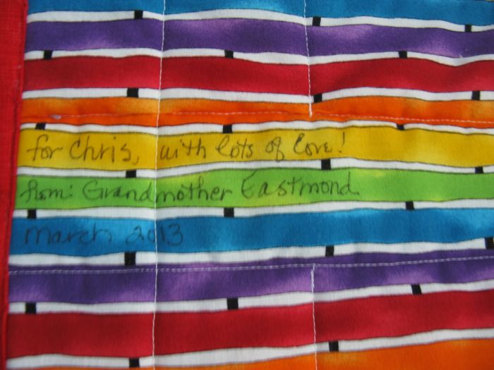 The “label.”  Sometimes with quilts I know will be washed and washed, I don’t mess with a formal label, but simply write directly on the quilt with a Micron Pen.