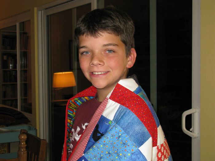 Later on, after dinner and all the adults talked, Chris nabbed it and settled into a movie.  Or was it a game?  I can see that at the dimensions of 46″ x 57″ he will soon outgrow the quilt, but I didn’t want it too big–it’s a “welcome to the family” quilt, like what his brothers received when they were newborns.