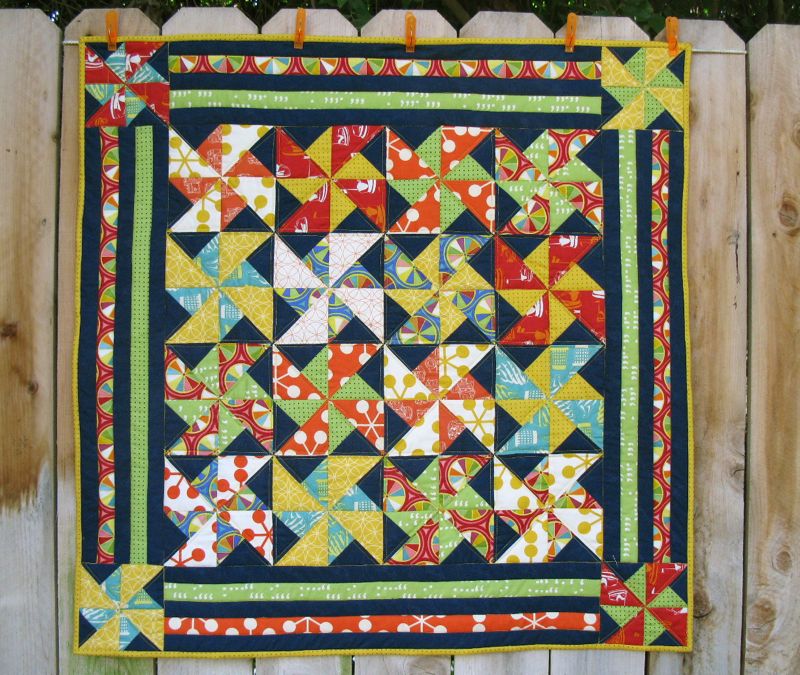 This quilt reminded me of summer days, of green lawns that you can lay down in and drift off, and of course, pinwheels that spin with the flick of a finger, or by holding them overhead while running. I was also reminded of local faires and immediately thought of Babe, the Gallant Pig, and Mr. and Mrs. Hoggett, cotton candy, ferris wheels.
