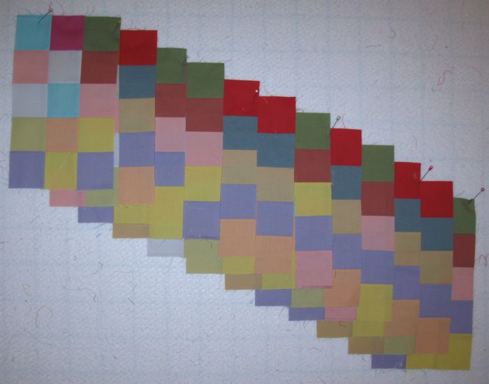 While this is how the pattern recommended we proceed, but when sewing them together I found lots of repeated colors.  Think carefully about where you sew your lights and mediums, trying not to have the same order of colors from bottom to top, otherwise you’ll find yourself with the problem I have below: