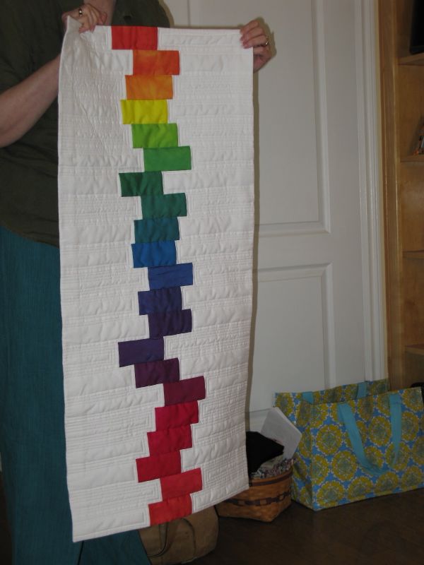 And Jean was the worker bee, finishing up another project. I quilted Citrus, Rhonda’s hot pads, ate chocolate, listened, talked, caught up with others, got tired and went home Saturday afternoon where I crashed on the bed and didn’t wake up even when the phone rang (it was my mother, and I called her back). So, if exhaustion is a barometer–it was a great success!