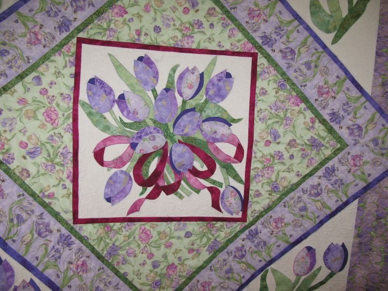 JoDy worked hard on this applique quilt, full of lavender tulips both in the applique and in the fabrics.
