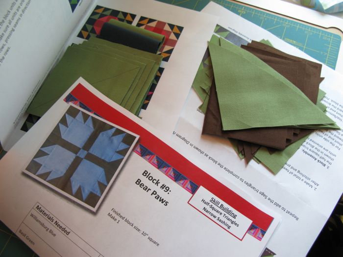 I also cut each block’s pieces all at once, then store them inside the pattern, all folded up for when I can get to the sewing. Done in parts, this quilt will be manageable, I think.
