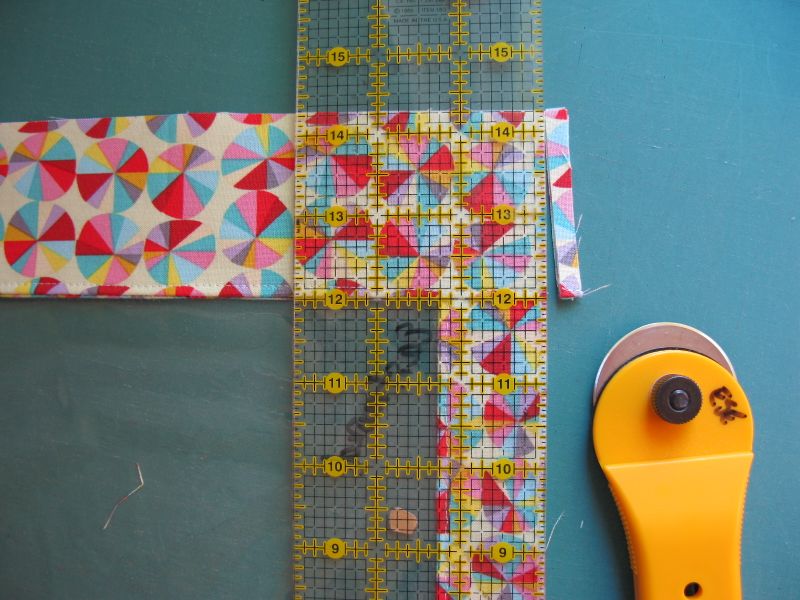 I’m trimming the excess fabric off the bottom strips in this photo.