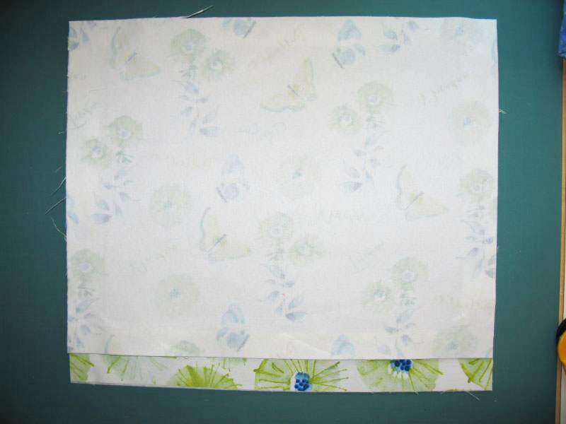 The side (1 1/2″ wide) strips go on first, on the shorter (15″) sides of the vinyl rectangle. Sandwich the vinyl between one interfaced piece of fabric and the other (un-interfaced, or plain) piece of fabric, lining up the raw edges, with right sides facing each other and towards the vinyl.
