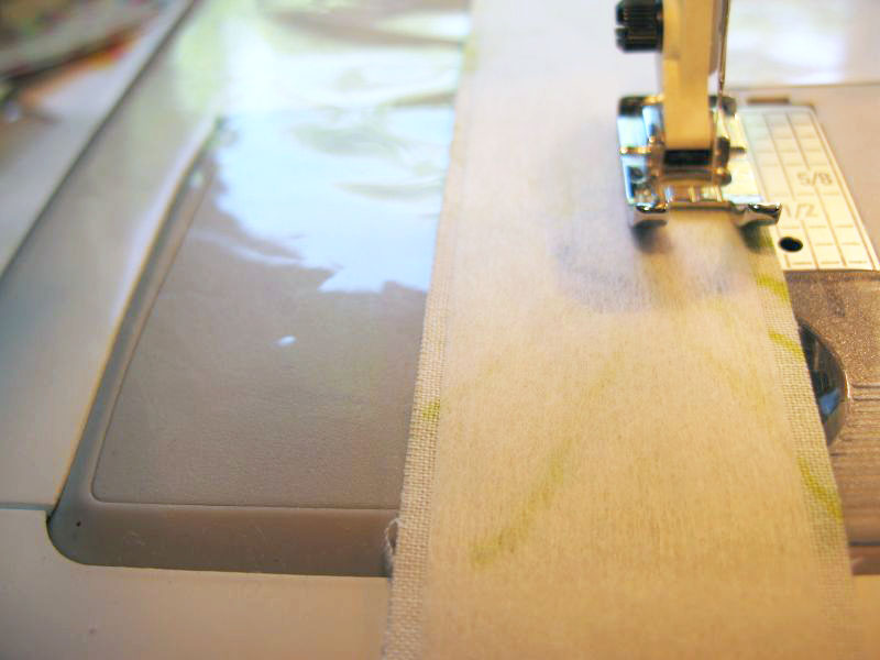 To put the upper, top strip on, sew ONE piece of wider (2 1/2″) interfaced fabric to the vinyl, right sides together. It’s easier if you put the vinyl to the feed dogs to do this step, and kind of ease it along.