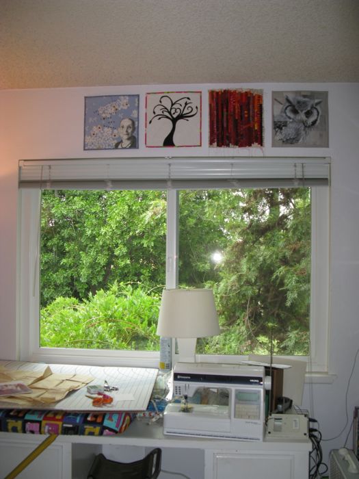 We put the Four-In-Art Quilts up above my window in my sewing room.  I like seeing them all lined up.  I don’t really live in a jungle.  It just looks like it from this window, with the mature trees in the background, the silk oak tree on the side, and my wild wisteria vines in the foreground.