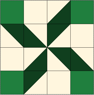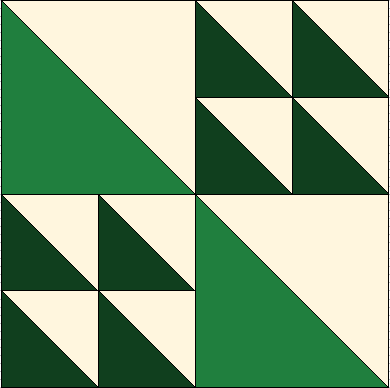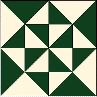 Caution: These template prints out the correct size on my printer, but I don’t know what they’ll do on yours.  A general guide for making a half-square triangle block is to cut the finished measurement, plus 7/8 inch, before stitching on the diagonal and cutting apart.  So, I’d use that as a general gauge for how things ought to look when you print out your templates.  (In other words, for the corner squares for this first block, cut one white square and one green square to measure 4 and 7/8 inches.)