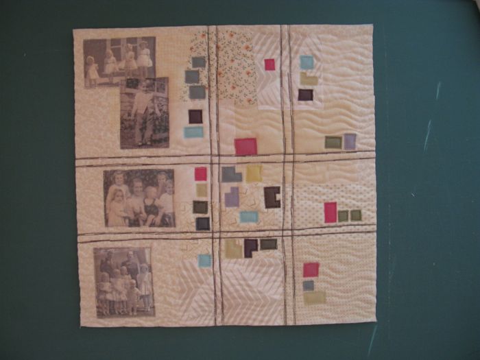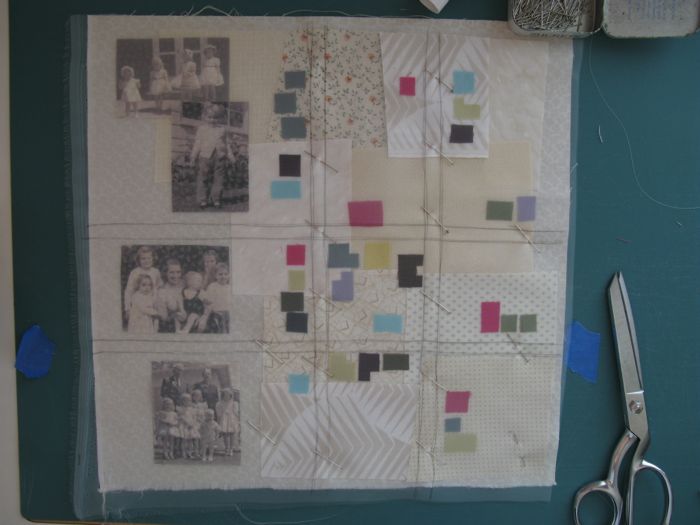 I printed out some family photos, using the usual method (freezer paper-backed fabric, taped to a piece of paper and fed through my trusty Epson inkjet printer), and started to add them.  This was the first try.  I kept moving them around until I got what I wanted, trimming some edges to make it fit, visually.