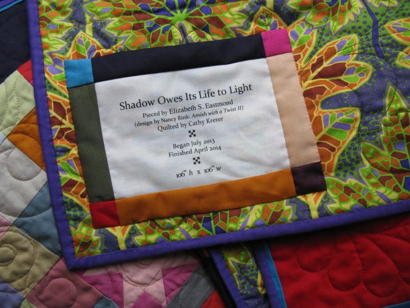 I thought about many names. I halfway thought I’d just keep Nancy Rink’s name for the quilt, but wanted something different. Certainly, since it has furrows of light and dark, calling it the oft-used “Sunshine and Shadow” would be a possibility. But I didn’t just want to say it THAT way. So I found this old proverb: Shadow Owes Its Life to Light, indicating the interdependence between light and shadow. Not only did I like it because its allusion to the old cliche, but it also had a nicely poetic rhythm to it.