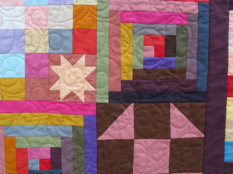 Beautiful quilt with a perfect name. I love the designs embedded in the log cabin blocks. They look like celestial bodies–stars, planets, comets, nebulae.