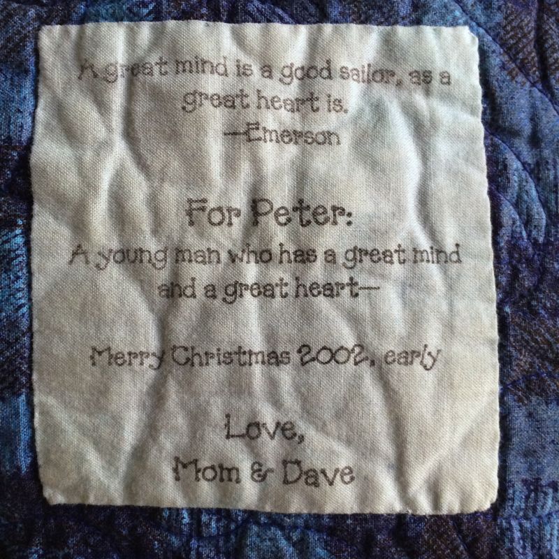 While I was in Washington DC, praying for the cherry blossoms to open (they almost did), my husband and I visited my son and were able to sleep under the quilt I made him when he went away to college, some twelve years ago (my, how time flies!). He admits that he doesn’t wash it too often, but here is a picture of the label, printed on my EPSON printer. I think it looks pretty good for being done all those many years ago.